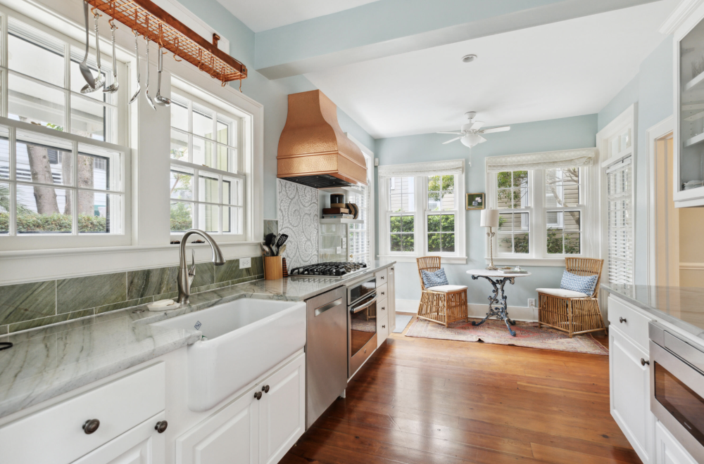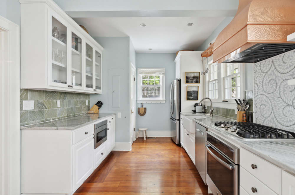 We can look closer at the Southern charm kitchen in the Duncan house to see what makes the design so immediately appealing. For starters, the colors are welcoming and peaceful. The muted blue of the wall is balanced nicely by the green backsplash tiles and the largely gray counters. Nothing is bright and overwhelming, but there is more than enough creativity in the color palette to make the space interesting and comfortable.