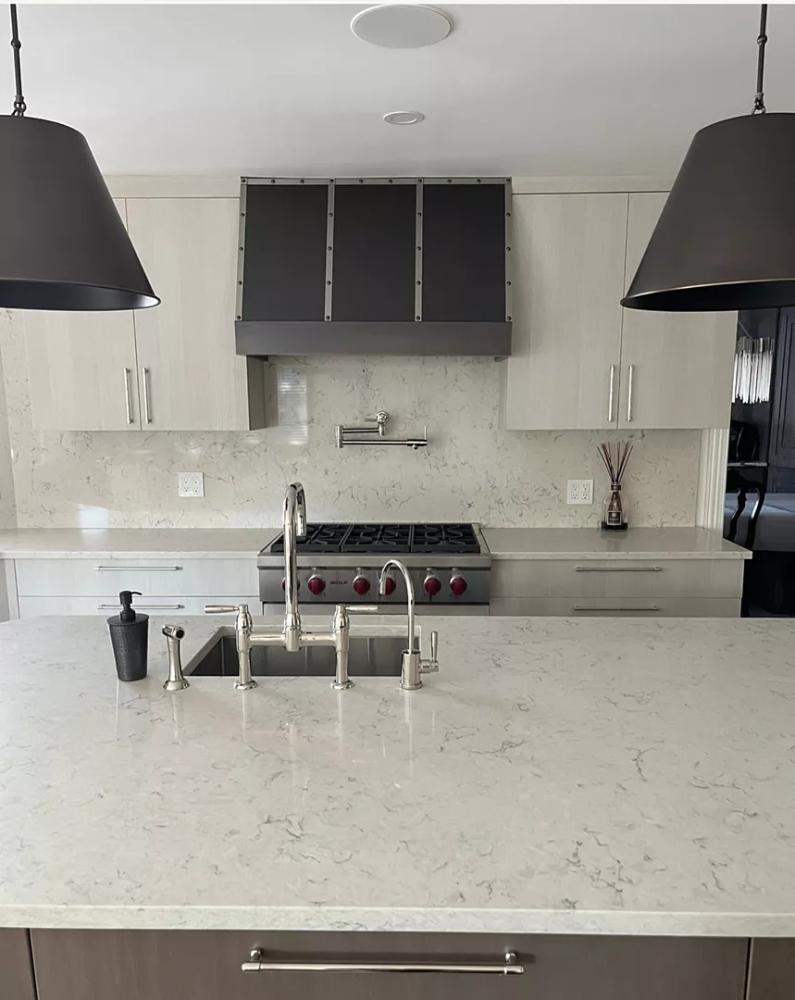 There are dark elements, there are light elements, and there is virtually nothing in between. This is done intentionally, of course, and the strategy worked perfectly. In addition to the hood, which we will talk more about in a moment, other dark elements include the range top, the light fixtures hanging over the island, and even a soap dispenser next to the sink.